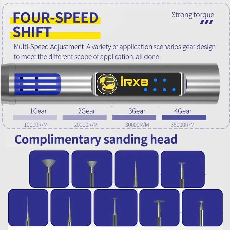 MECHANIC IRX8 Rechargeable Wireless Small Handheld Chip Polishing Pen Mini Electric Engraving Pen Mobile Phone Grinder. Mechanic IRX8 multifunctional IC chip grinding glue polishing pen, electric drill, grinding rotary tool, emery grinding head is the best product to remove IC chip glue.