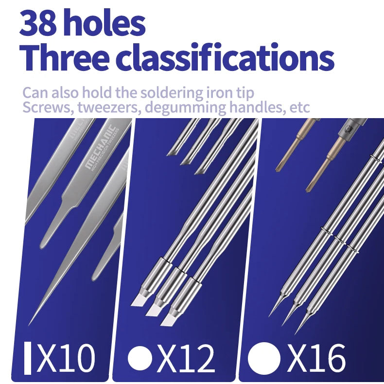 2. 38 holes, three classifications, can also hold the soldering iron tip, screws, tweezers, degumming handles, etc.