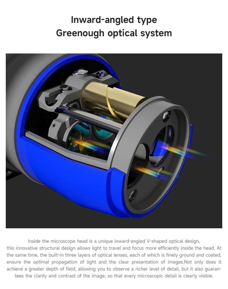 2. Continuous/fixed gear, variable magnification conversion function.Realize the handwheel magnification limit. Inward-angled type greenough optical system.