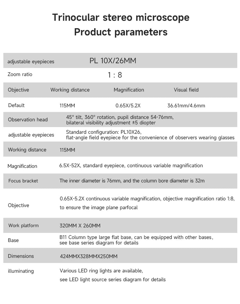Objective: 0.65X-5.2X continuous variable magnification, objective magnification ratio 1:8, to ensure the image plane is parfocal.