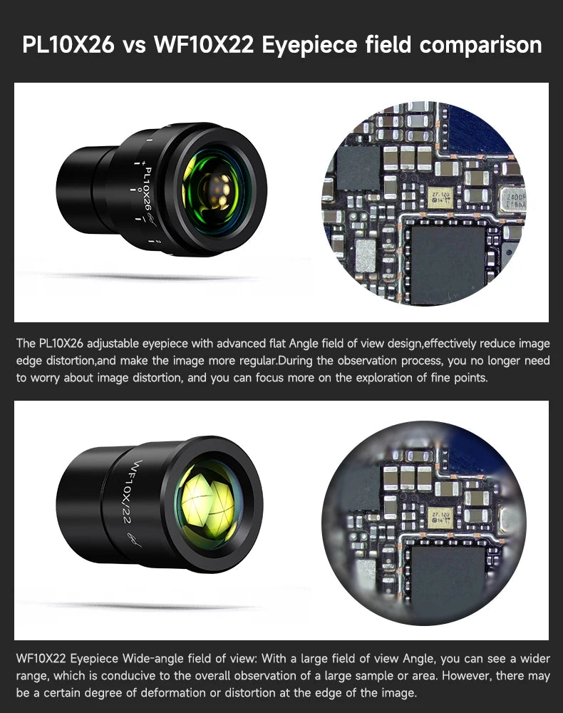 Adjustable eyepieces: Standard configuration: PL10X26, flat-angle field eyepiece for the convenience of observers wearing glasses.